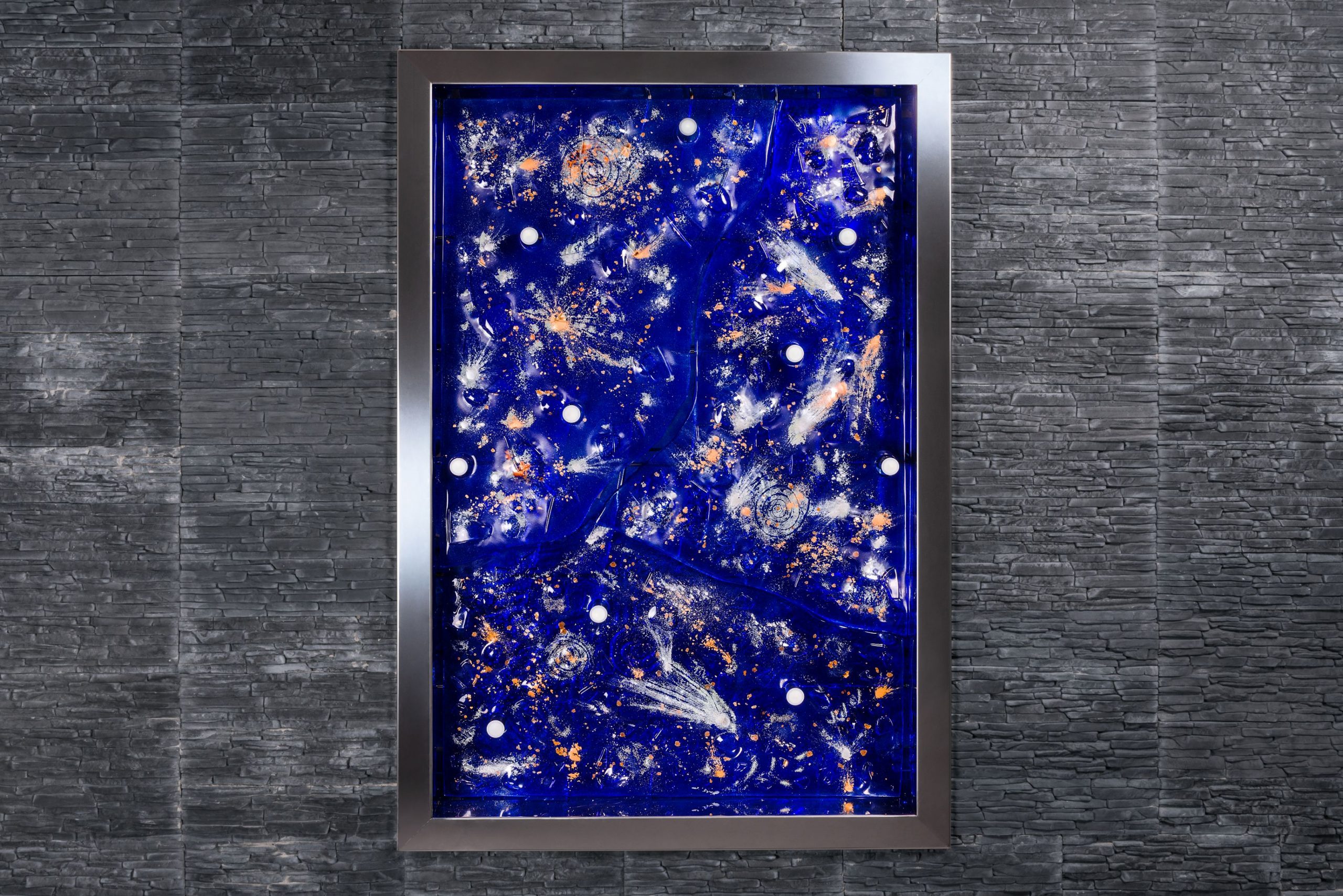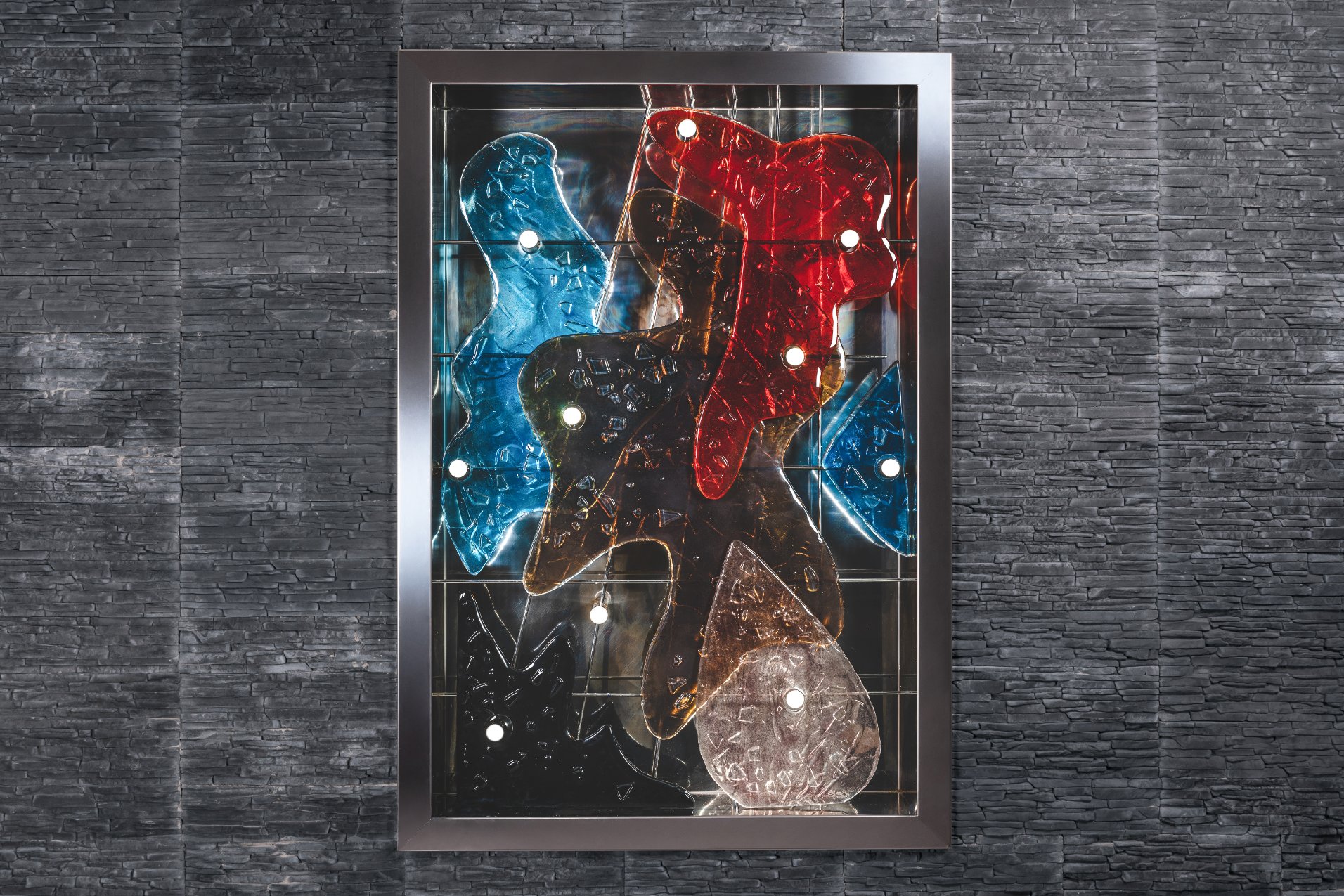 Motív tvorený farebnou škálou skla taveného pri teplote 820°C, ktorý má predstavovať abstraktné umelecké dielo. Je tvorený na objednávku a je jedinečný.