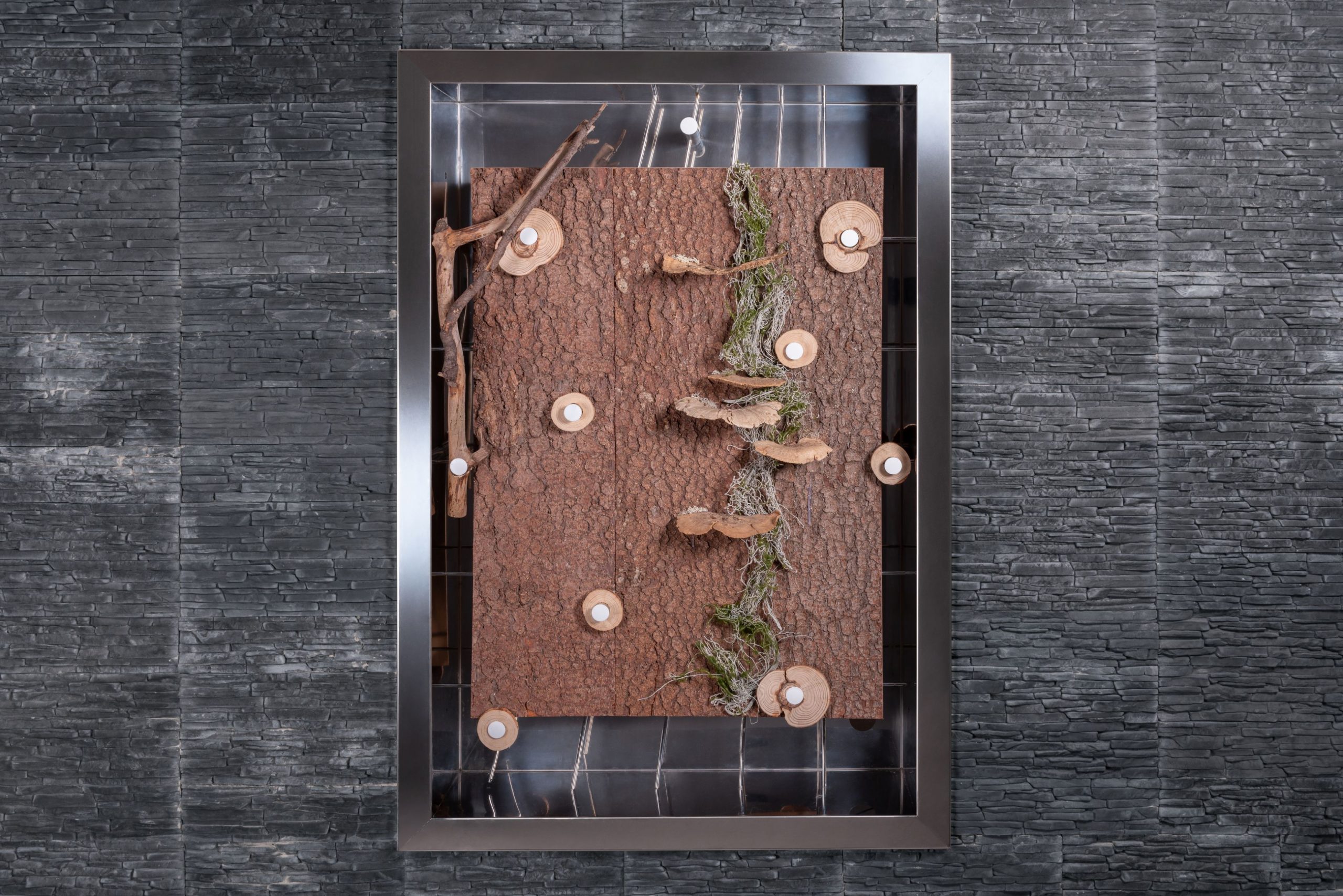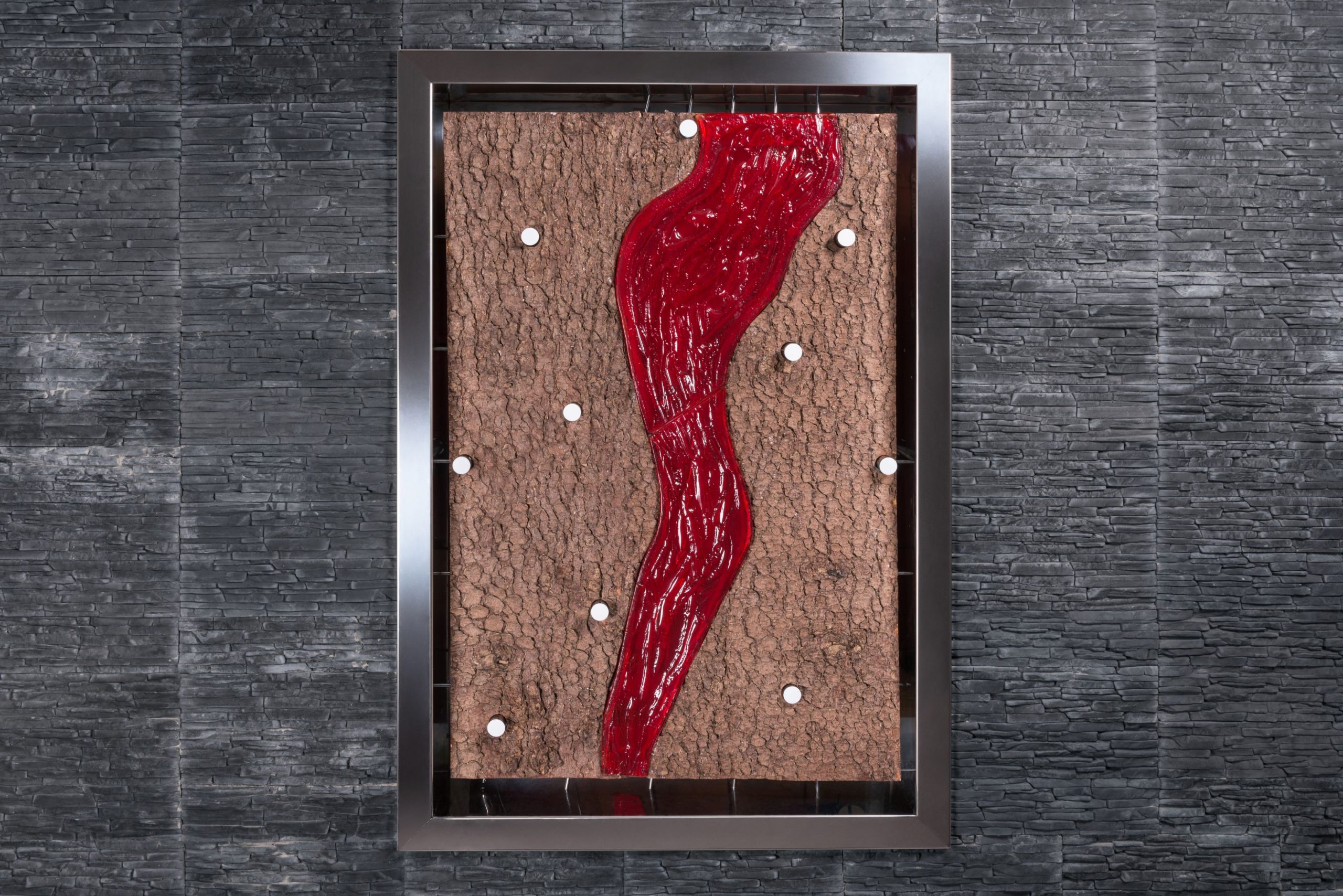 Motív pozostáva z ručne taveného skla doplneného o kôru stromu zo Slovenských lesov. Kombinácia skla a kôry predstavuje tečúcu lávu po vyprahnutej zemi.